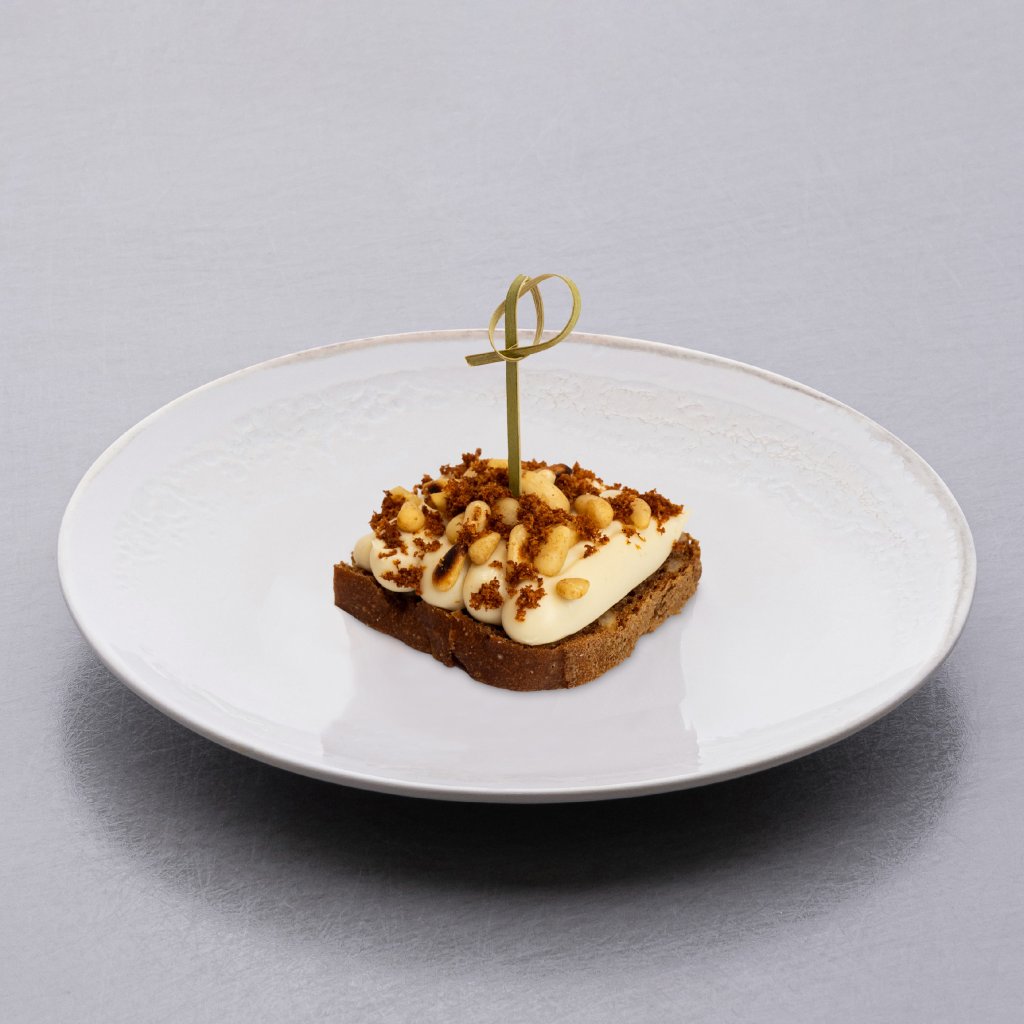 Canapé on rye bread with Jerusalem artichoke purée, brown butter, pine nuts and watercress